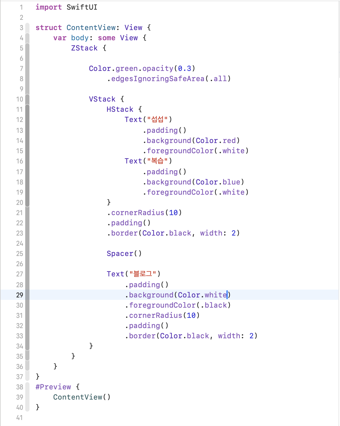 이렇게 두 텍스트가 같이 화면에 나타날 수 있는 이유는 ZStack을 배치 한 후 그 아래에 VStack과 HStack이 위치하기 때문입니다.